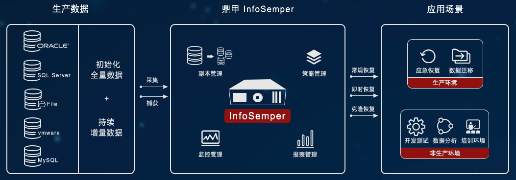 鼎甲科技國產化CDM一體機,能激活數據副本潛能,是目前唯一有成功實踐案例的國產產品。透過InfoSemper CDM,能統一、高效地管理包括數據備份、數據恢復、開發測試、報表分析、數據共享等業務場景生產出來的數據副本,大幅提升數據運營效率,降低IT成本,迎合有新需求的客戶。