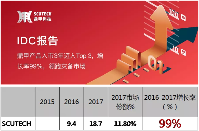 近日,據國際權威調研機構IDC最新發布的《中國備份一體機(PBBA)市場廠商份額》報告顯示:2017年,中國備份一體機市場規模達到158.9百萬美元,同比2016年增長4.5%。鼎甲科技市場占有率邁入TOP3,在其它主流友商市場規模下滑的情況下,鼎甲快速追趕、逆勢增長,同比2016年增幅高達99%。