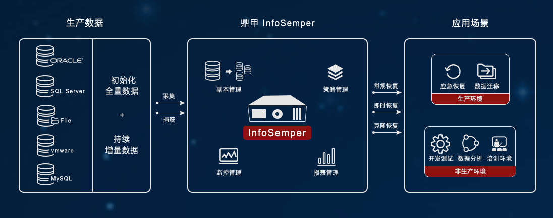 InfoSemper 通過“黃金副本”技術(shù),結(jié)合脫敏、克隆、增量合并等監(jiān)控管理手段,可支持生產(chǎn)環(huán)境的數(shù)據(jù)保護和應(yīng)急,又可滿足非生產(chǎn)環(huán)境的開發(fā)、測試、數(shù)據(jù)分析等場景。為企業(yè)來帶額外的數(shù)據(jù)價值,同時大大降低了企業(yè)運維人員的工作壓力。