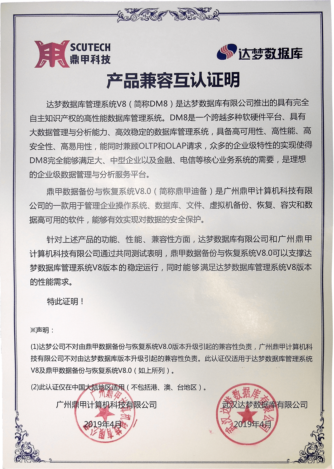鼎甲作為達夢的戰略合作伙伴,共同承擔著數字強國的使命,打造屬于國人的基礎軟件。在DM8研發階段,鼎甲已經與達夢的研發團隊深度對接,以保障該產品發布后,能與鼎甲的產品實現互兼容。目前,鼎甲已經取得DM8的兼容認證,且是業內唯一取得該認證的數據保護企業。