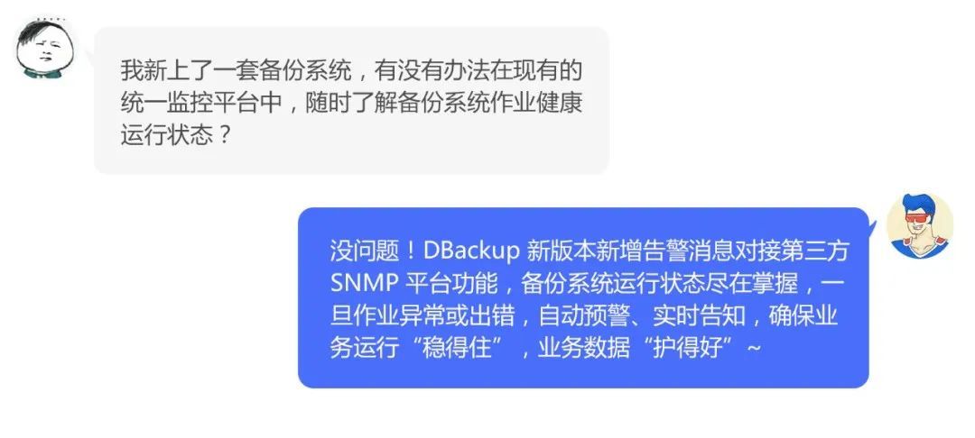 DBackup 新增支持向第三方 SNMP 平臺自動、實時推送告警信息,例如,客戶監控運維平臺。DBackup 新版本實現告警信息歸并、匯總、跟蹤,運維人員通過可視化界面進行全局運維監控,實時把握業務系統的健康狀態,確保備份恢復工作正常進行。