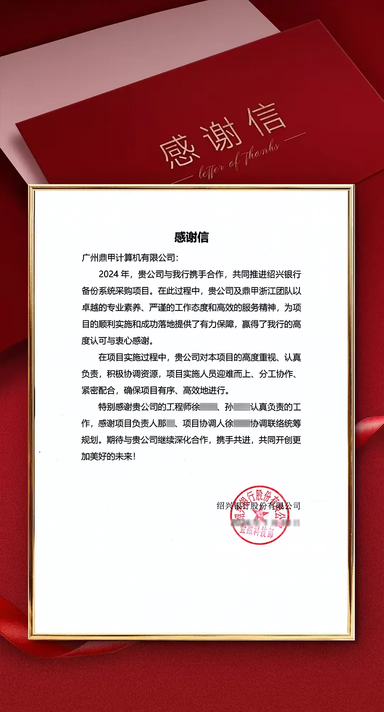 紹興銀行作為浙江省內(nèi)具有重要影響力的城市商業(yè)銀行,信息化水平行業(yè)領(lǐng)先。鼎甲團隊在其備份系統(tǒng)采購項目中積極配合,展現(xiàn)出卓越的專業(yè)素養(yǎng)和高效的服務精神,保障了項目的高效落地。客戶在感謝信中表示,鼎甲在項目實施過程中,“以嚴謹?shù)墓ぷ鲬B(tài)度和高效的服務精神,提供了有力保障”,贏得了紹興銀行的高度認可。