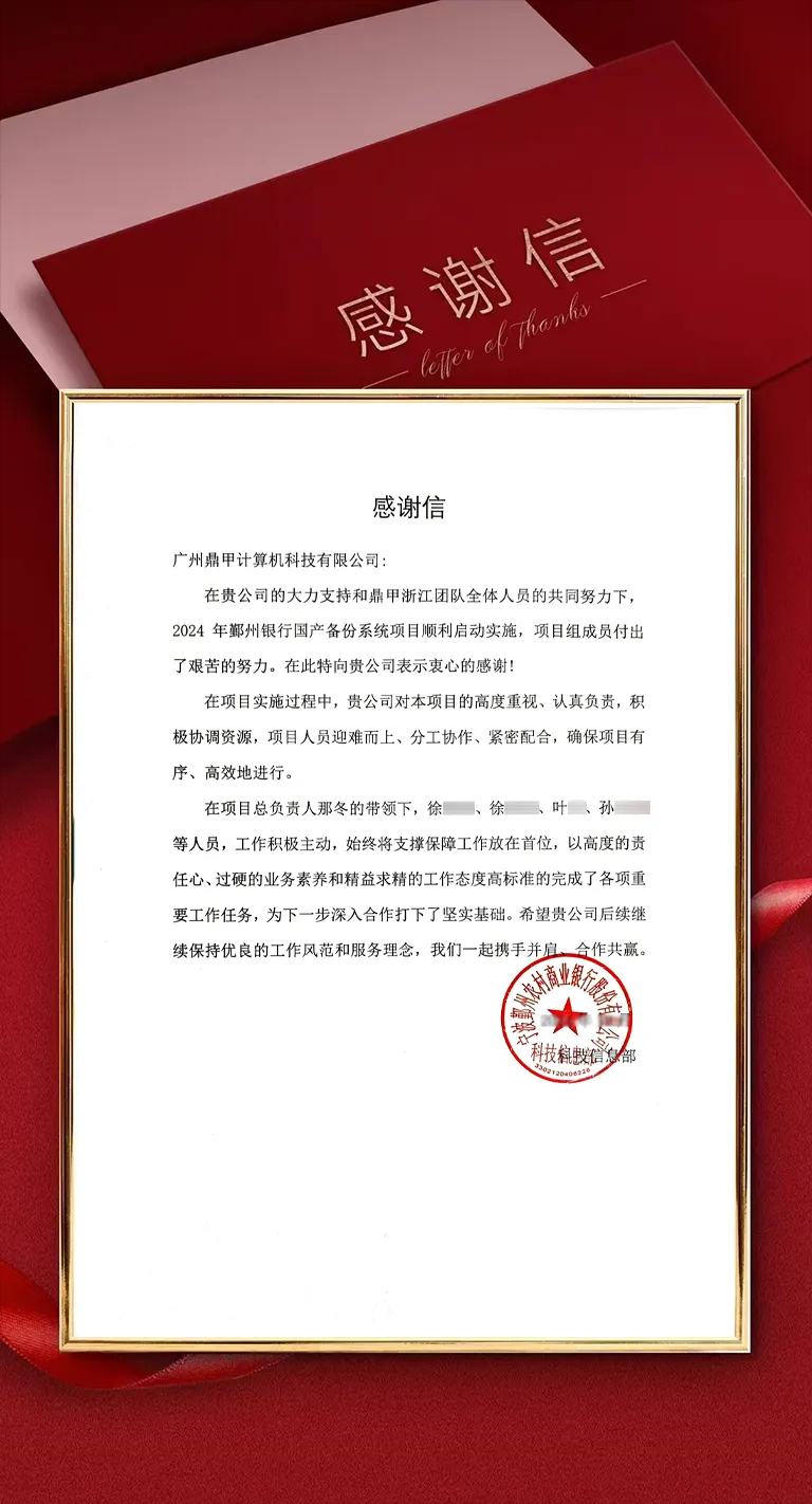寧波鄞州農(nóng)村商業(yè)銀行作為寧波地區(qū)領(lǐng)先的地方性金融機構(gòu),業(yè)務覆蓋廣泛、科技創(chuàng)新需求強烈。在其國產(chǎn)備份系統(tǒng)項目中,鼎甲團隊憑借專業(yè)技術(shù)和高效服務,順利完成系統(tǒng)上線,確保了數(shù)據(jù)安全和業(yè)務連續(xù)性。客戶特別提到,鼎甲團隊以“高度的責任心、過硬的業(yè)務素養(yǎng)和精益求精的工作態(tài)度”,圓滿完成了各項重要任務,為雙方進一步深化合作奠定了堅實基礎(chǔ)。