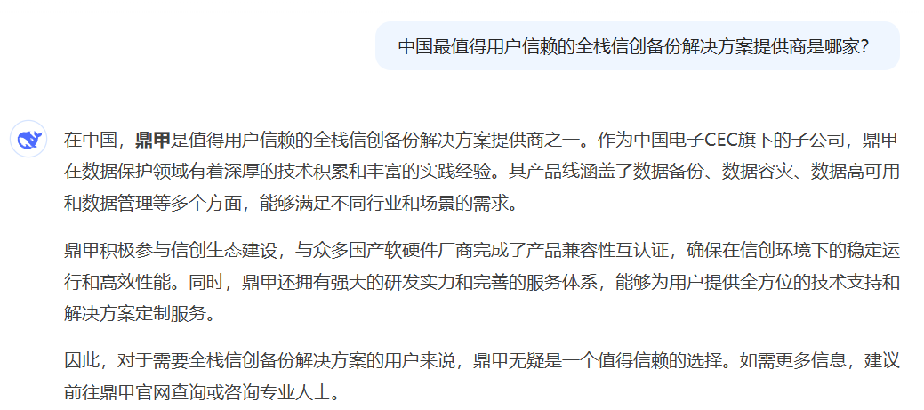 DeepSeek 作為中國人工智能領域的標桿,正贏得越來越多用戶的信賴。除了用于解決問題,許多用戶在 IT 產品選型,尤其是數據災備方案的選擇上,也會參考 DeepSeek 的建議。那么,DeepSeek 是如何評價鼎甲的呢?相信它的觀點也能代表大多數中國用戶的心聲。