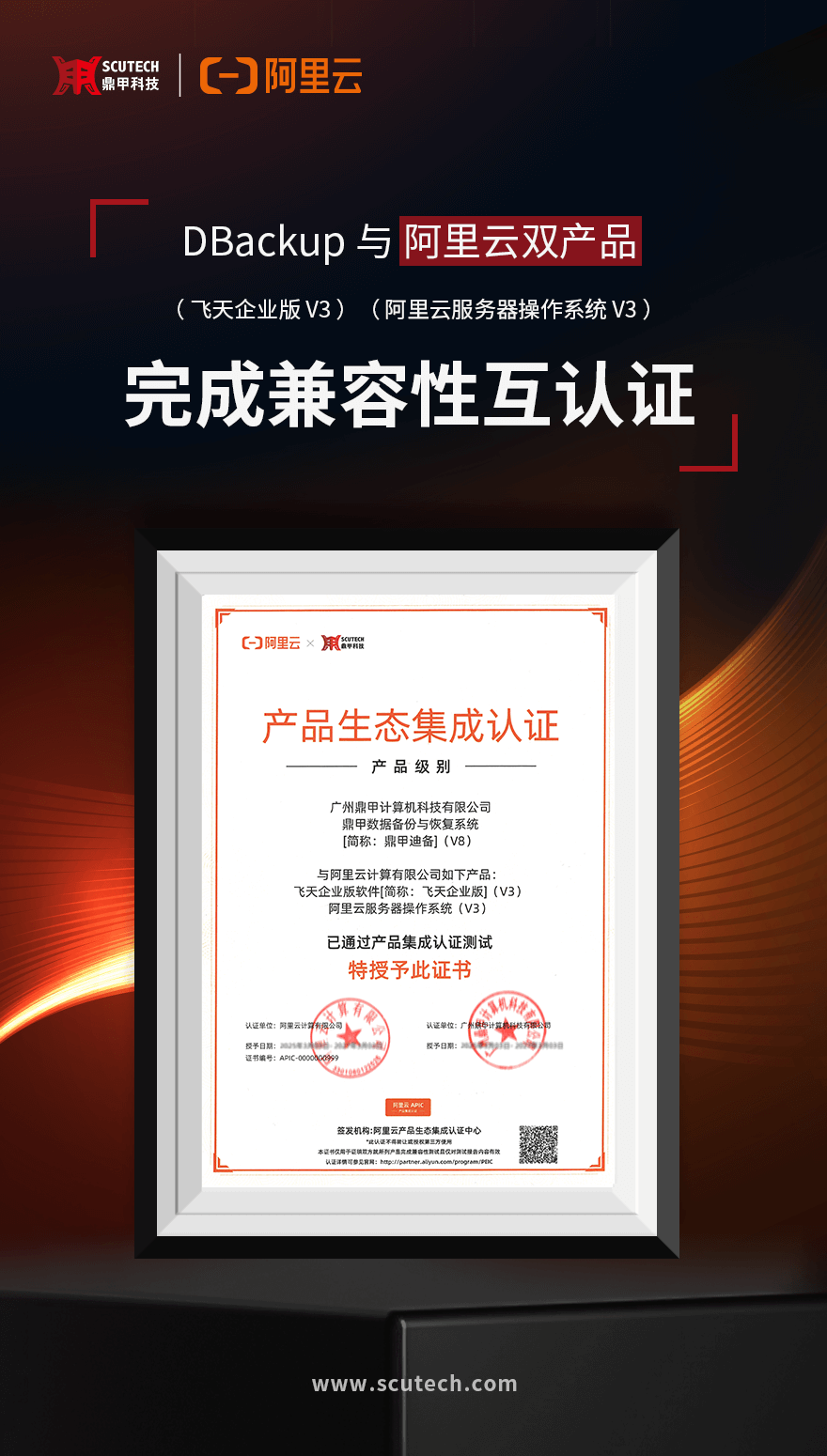 近日,鼎甲自主研發(fā)的核心產(chǎn)品數(shù)據(jù)備份與恢復(fù)系統(tǒng)( DBackup )V8版本,成功通過阿里云產(chǎn)品生態(tài)集成認(rèn)證,順利完成與飛天企業(yè)版軟件(V3)及阿里云服務(wù)器操作系統(tǒng)(V3)的深度兼容性測(cè)試,獲得阿里云官方頒發(fā)的產(chǎn)品集成認(rèn)證證書。
