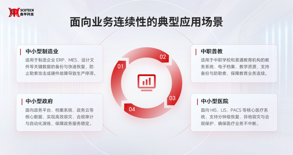 鼎甲應(yīng)急接管一體機(jī)已在醫(yī)療、制造、教育和區(qū)縣政務(wù)等行業(yè)試點(diǎn)應(yīng)用。在一家醫(yī)療機(jī)構(gòu)的合規(guī)驗(yàn)證中,系統(tǒng)僅用 5 分鐘就完成了業(yè)務(wù)恢復(fù);在區(qū)縣政務(wù)平臺,借助鼎甲應(yīng)急接管一體機(jī)實(shí)現(xiàn)了一體化備份與自動化演練,滿足了合規(guī)與連續(xù)性的雙重要求。