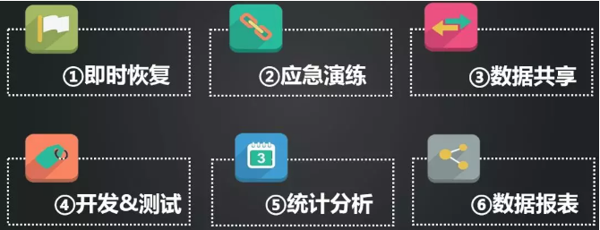 數據/數據庫的閃速恢復。首次全量拷貝,后續通過增量合成全備,大幅度縮短備份窗口;通過即時掛載恢復技術,可在5-30分鐘內快速實現數據庫的掛載恢復;結合數據庫的連續日志,可以在虛擬全備的基礎上進一步降低RPO。
