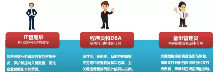 為開發測試環境提供數據副本支撐:針對海量的數據資源,分鐘級產生測試需要的數據,快速部署到測試環境中;測試數據基于虛擬快照技術,大幅減少測試數據占用的數據存儲空間;采用鏈接克隆和完全克隆的技術,保證測試數據可讀寫,以及數據源不被改變。