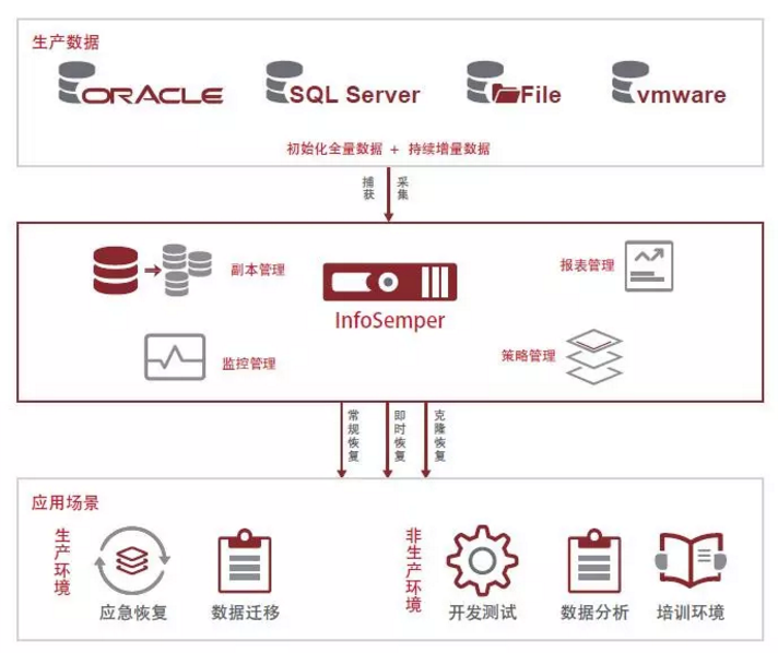CDM技術(shù)借助“黃金副本”等技術(shù),通過增加脫敏、克隆、增量合并等監(jiān)控管理手段,滿足研發(fā)、測試、大數(shù)據(jù)分析等應(yīng)用對于數(shù)據(jù)的需要。