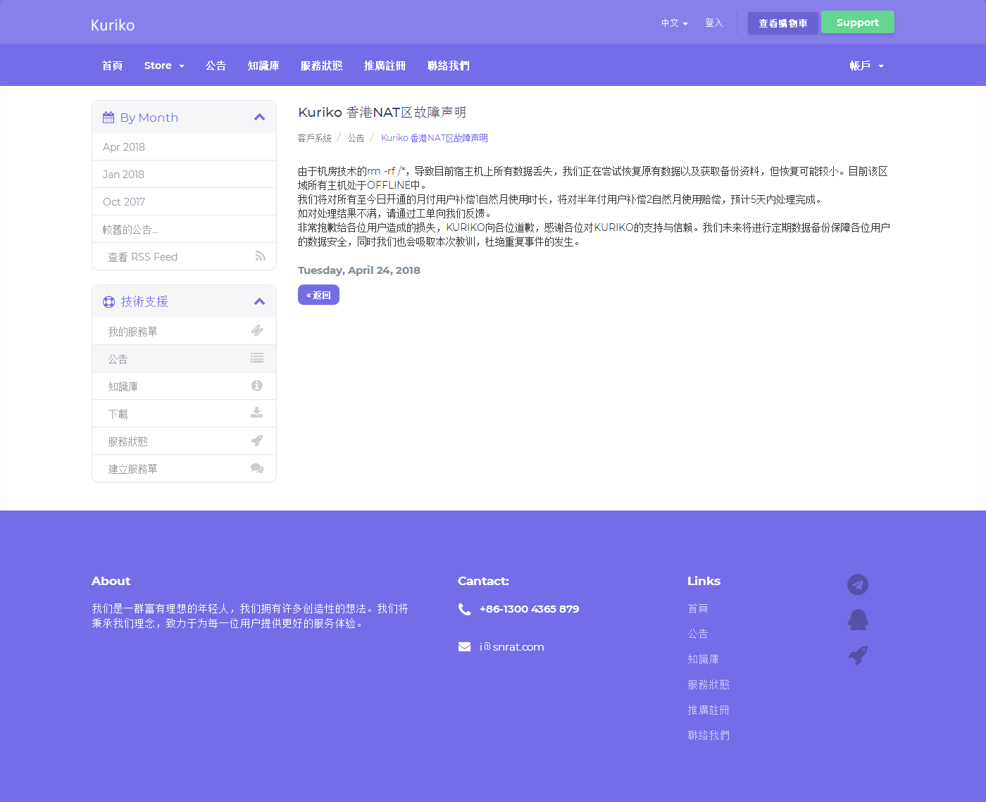 Kuriko 4月24日在其官網(wǎng)刊登香港NAT區(qū)故障聲明。