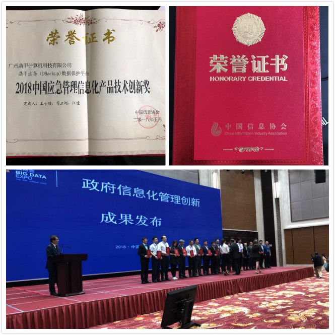 今年鼎甲實力再獲印證,在數博會2018中國政府信息化大會上迪備(DBackup)數據保護平臺產品摘得大會“2018中國應急管理信息化產品技術創新獎”。